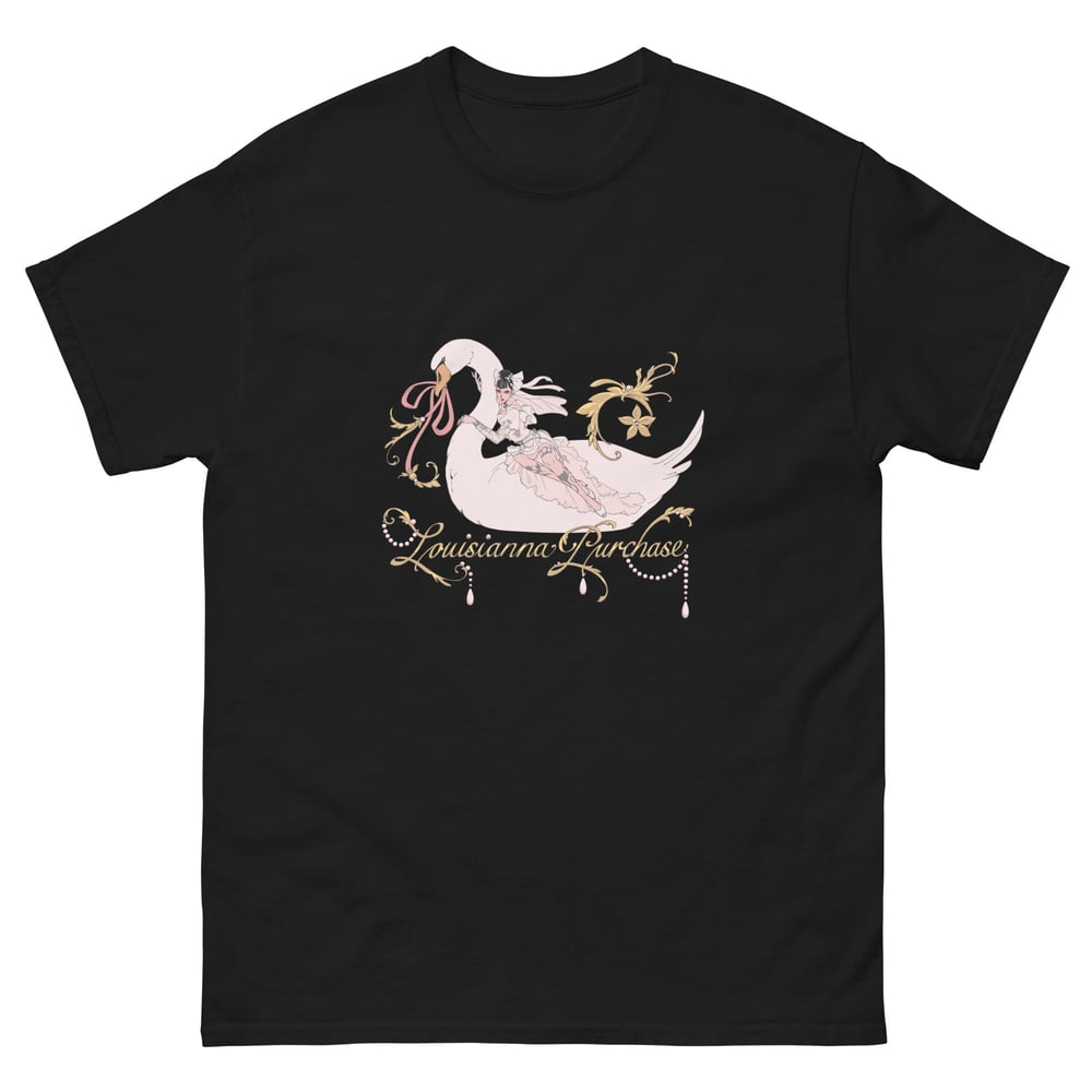 Louisianna Purchase swan shirt, illustrated by MinJi K Yoon. Printed on Gilden unisex Classic black shirt.